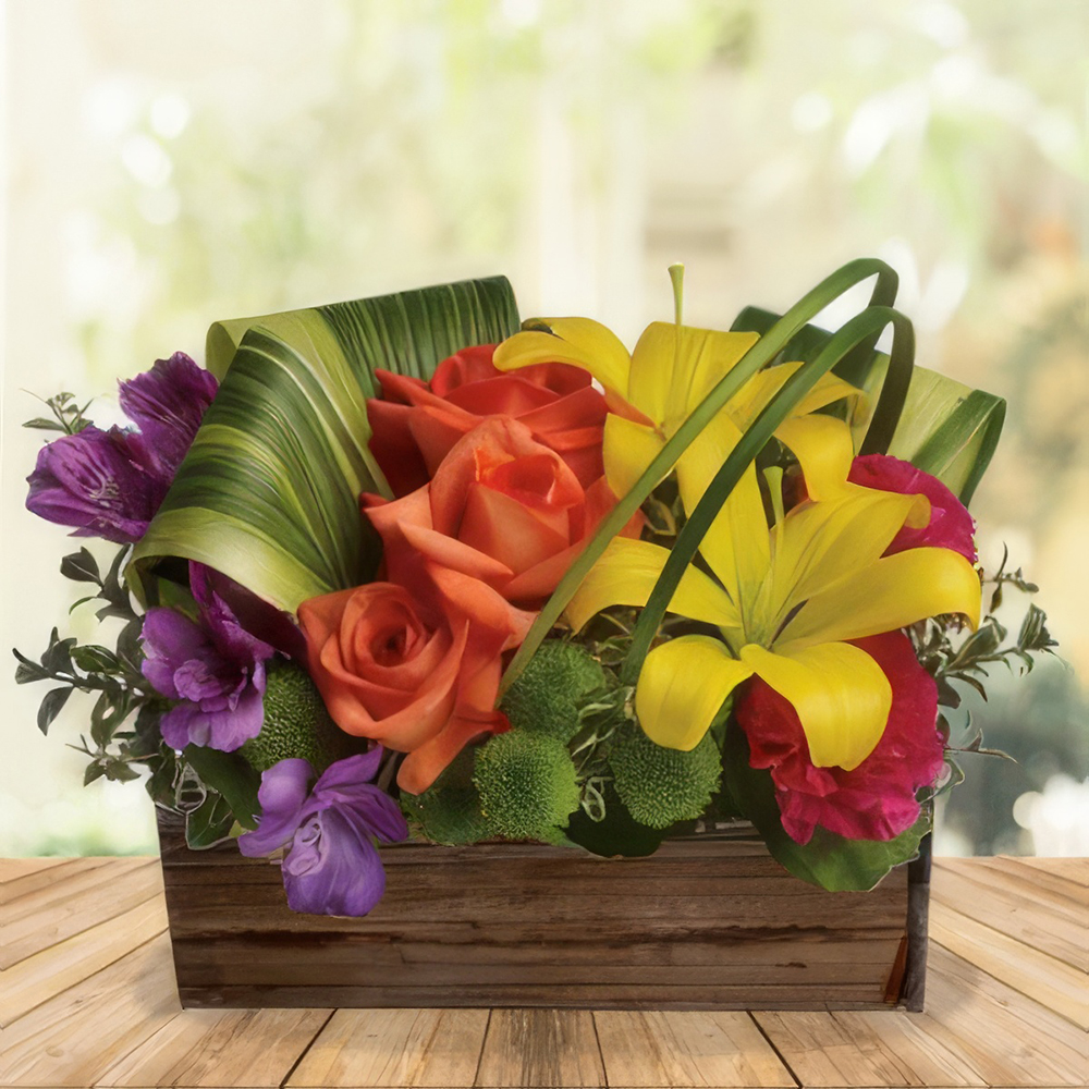 Il est impossible de ne pas s’émerveiller à la vue de cette boîte de fleurs éclatantes.ce cadeau allie un style moderne à la beauté intemporelle des lys, des roses et des alstrœmerias.
